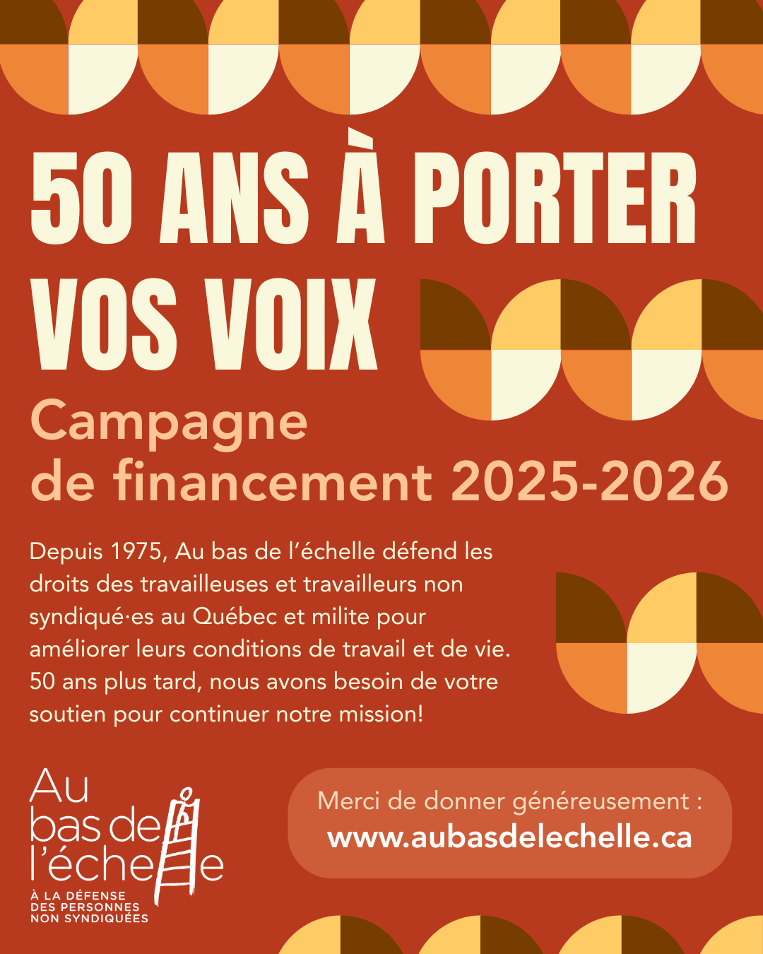 Depuis 1975, grâce à une démarche d'éducation populaire et de défense des droits, Au bas de l'échelle vient en aide aux travailleuses et travailleurs non syndiqué·es qui vivent des problèmes en matière de normes du travail. En 2025, nous soulignons ces 50 ans à lutter pour l'amélioration des conditions de travail et de vie des personnes non syndiquées dans l'ensemble du Québec!
