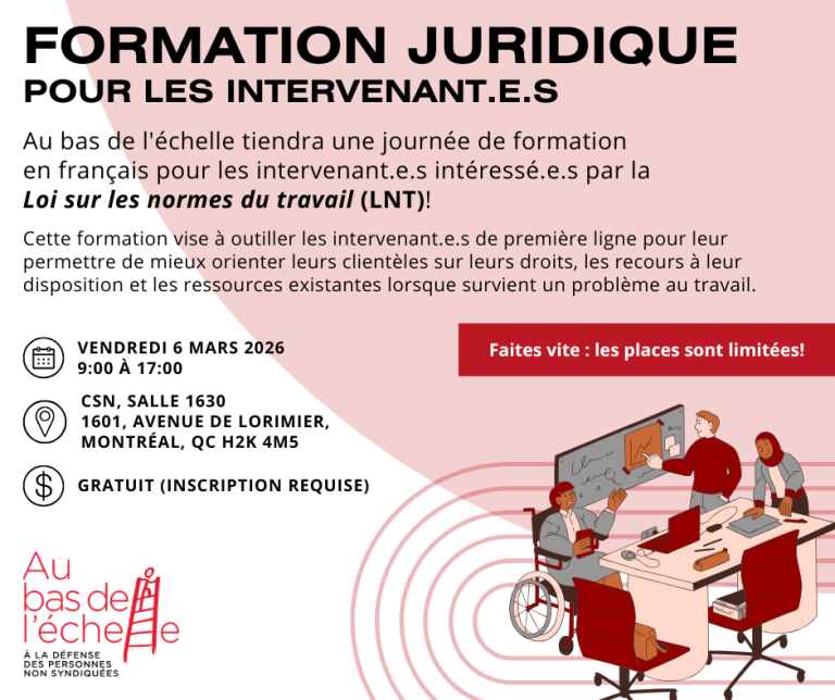 Au bas de l’échelle tiendra une journée de formation en français pour les intervenant.e.s intéressé.e.s par la Loi sur les normes du travail (LNT)!